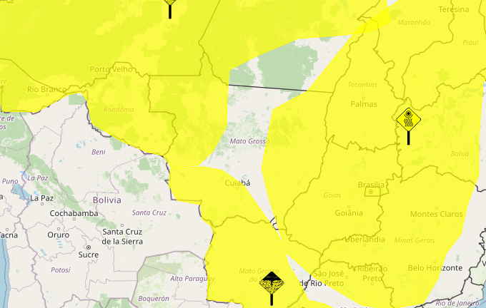 O aviso atinge cidades de diferentes regiões do estado Várzea Grande, Rondonópolis, Tangará da Serra, Cáceres, Chapada dos Guimarães e Pontes e Lacerda.