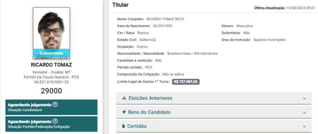 Cuiabá terá quatro candidatos a prefeito nas eleições deste ano e não cinco, como estava previsto após o fim das convenções municipais. Isto porque o candidato do Partido da Causa Operária (PCO), Ricardo Tomaz Júlio Neto, desistiu de concorrer. O partido havia anunciado que teria candidatura própria e chegou a apresentar a ata da convenção à Justiça Eleitoral. No entanto, o PCO não fez o pedido de registro para o cargo de prefeito e Ricardo Tomaz, que é o presidente da sigla na capital, preferiu fazer o pedido de registro para concorrer ao cargo de vereador. O nome dele já consta no sistema da Justiça Eleitoral e sua candidatura para a Câmara aguarda julgamento.