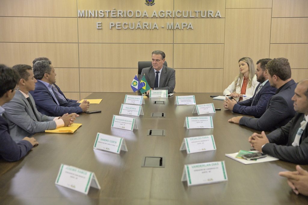 O ministro da Agricultura e Pecuária, Carlos Fávaro, recebeu prefeitos e vereadores mato-grossenses para debater as demandas de estruturação da atividade agropecuária nos municípios. Participaram do encontro, na sede do Ministério da Agricultura e Pecuária (Mapa), em Brasília, na noite desta terça-feira (4), os prefeitos de Canabrava do Norte, Professor Neuilson; de Nortelândia, Mariano Gomes; de Peixoto de Azevedo, o Paulistinha e de São José do Xingu, Dr. Sandro, além dos vereadores de Canabrava do Norte.