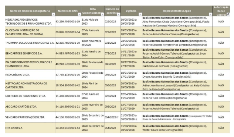 De acordo com o requerimento, algumas das empresas envolvidas são: MeuCashCard Serviços e Financeiros Ltda, Taormina Soluções Financeiras S.A., Pix Card Serviços Tecnológicos e Financeiros Ltda, Neo Crédito Ltda, Nio Meios de Pagamento Ltda, Vemcard Participações Ltda e Mettacard Administradora de Cartões Ltda. Todas estariam credenciadas pelo próprio Governo do Estado para operar descontos em folha, mas sem a necessária autorização do Bacen.