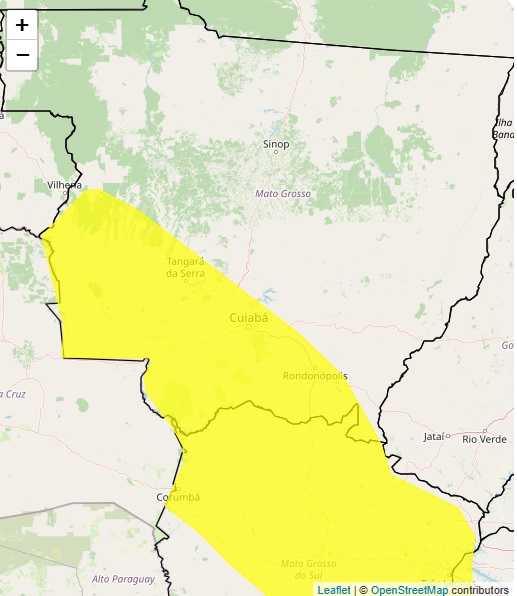 Segundo o Inmet, a tempestade pode também atingir outros municípios de Mato Grosso, desde Rondonópolis até Tangará da Serra.