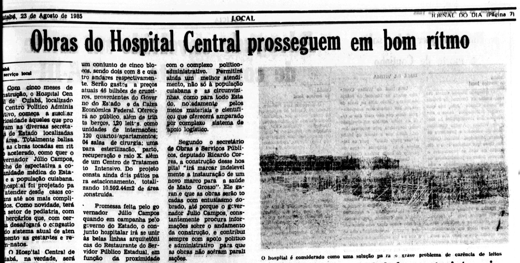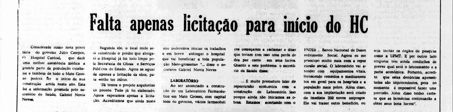 “As obras de construção do Hospital Central, na Avenida Rubens de Mendonça, não foram ainda iniciadas simplesmente por falta de recursos financeiros. Os trabalhos deveriam começar em janeiro passado, mas como o dinheiro esperado ainda não foi liberado, o início da construção teve que ser retardado, conforme informou o presidente da Companhia de Desenvolvimento do Estado de Mato Grosso, arquiteto Gustavo de Arruda”, diz a reportagem.