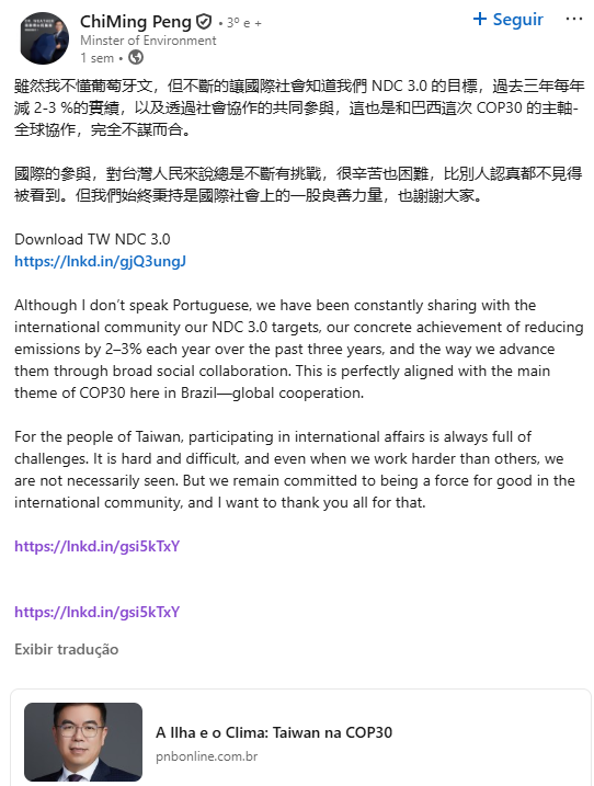 O ministro do Meio Ambiente de Taiwan, Peng Chi-ming, usou a rede social LinkedIn para divulgar um artigo de sua própria autoria que foi publicado na no site PNB Online. No artigo A Ilha e o Clima: Taiwan na COP30, o ministro trata das tentativas mundiais para barrar o aquecimento global e das iniciativas de Taiwan com metas ambiciosas para uma transição de baixo carbono.