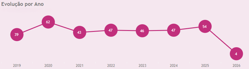 A série histórica mostra que o número anual de casos variou ao longo do período. Em 2019 foram 39 feminicídios. O total subiu para 62 em 2020, caiu para 43 em 2021 e voltou a crescer nos anos seguintes, com 47 registros em 2022, 46 em 2023 e 47 em 2024. Em 2025 foram contabilizados 54 casos. Em 2026, até 4 de março, há quatro registros.