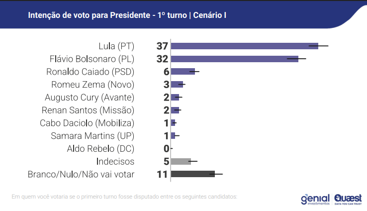 A disputa de 1º turno mostra Lula na liderança (37%), seguido de Flávio Bolsonaro (32%). O governador de Goiás, Ronaldo Caiado (PSD) vem em terceiro, com 6%.